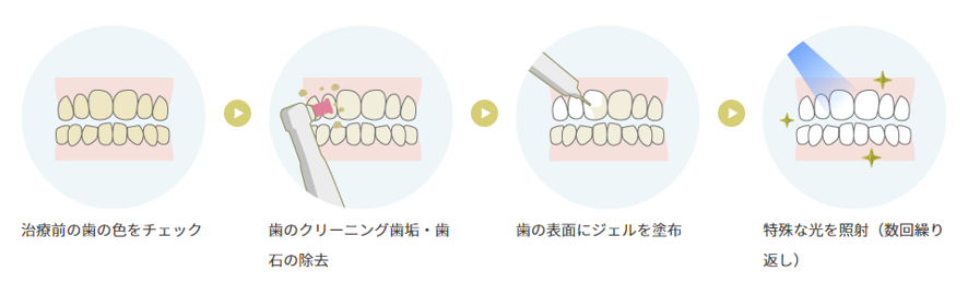 薬剤を歯面に塗布し、専用のライトを使用することで歯の黄ばみとなる原因を分解していきます。