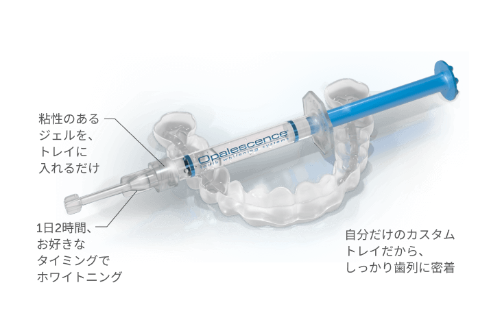ご自身で漂白効果のある薬剤をマウスピースに入れ装着し、約2週間ほど1日2時間