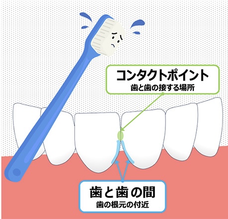 では何故専用の清掃グッズを使った方が良いのでしょうか。それは,歯ブラシだけでは歯間部のプラークの除去率は約40〜60%と言われています。歯と歯が接する場所は、小さな細菌は入り込めても歯ブラシの毛先は物理的に入れなく、むし歯が出来やすいポイントです!また、歯と歯の間も歯ブラシが当たりにくく、しっかり歯磨きをしているつもりでいても、よ〜く見るとプラークが残ったまま・・・という事が多いです。